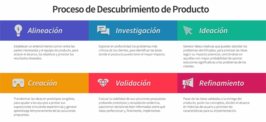 Todo inicia con la fase de descubrimiento de producto, donde se originan las ideas y se define la mejor estrategia para su implementación.